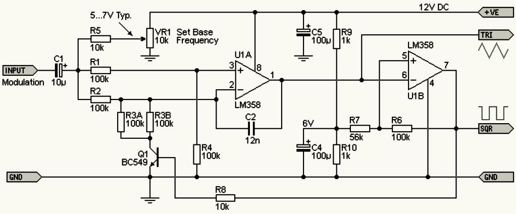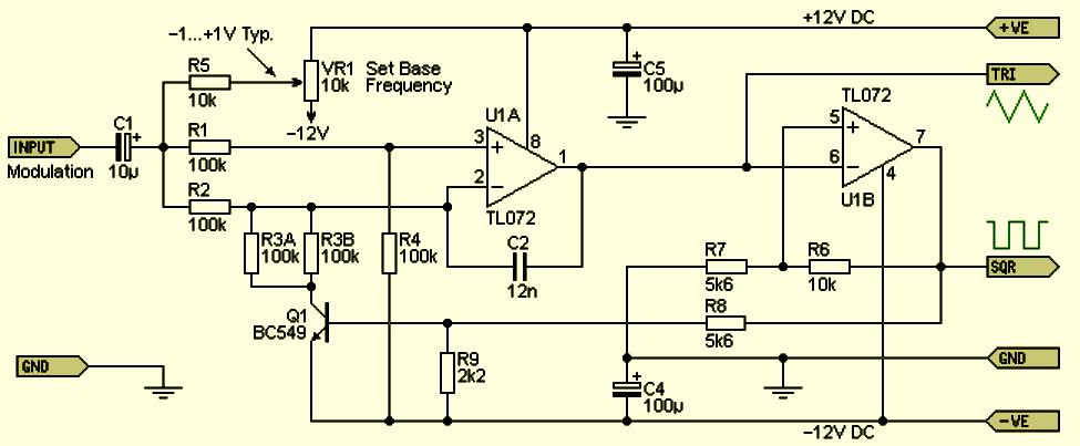 Выходные сигналы U1A и U1B более или менее симметричны относительно нуля. Начальная частота может быть установлена потенциометром VR1, а сигнал модуляции симметричен относительно нуля. Если цепь источника имеет непосредственную связь (если закоротить конденсатор C1), она должна обеспечивать некоторый ток. В среднем положении потенциометра входное напряжение не будет нулевым (как может показаться на первый взгляд). Напряжение будет около -1,3 В, и для получения линейного изменения частоты источник модулирующего напряжения должен иметь низкий выходной импеданс. При желании входной сигнал может подаваться через буфер на дополнительном операционном усилителе, но для большинства приложений в этом нет необходимости.