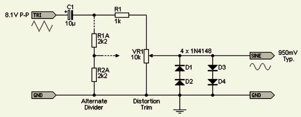 Если вы не слишком беспокоитесь о минимизации искажений. просто используйте пару резисторов 2,2 кОм (обозначенных как «Alternate Divider», R1A и R2A). Схема, показанная на рисунке, рассчитана на входное напряжение около 8 В (пик-пик). Именно такой сигнал выдает ГУН на второй схеме. Если вы используете первую версию с одним источником питания, можно подавать сигнал на диодный ограничитель через конденсатор на 10 мкФ и одиночный резистор 1к. Просто удалите из схемы элементы VR1, R1A и R2A и подключите R1 напрямую к диодам.