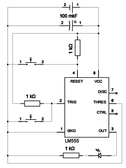 Бистабильный режим используется в приложениях довольно редко. Работа микросхемы в этом режиме напоминает RS-триггер. 555 работает как переключатель. Нажали на кнопку — включился. Нажали на другую — выключился.